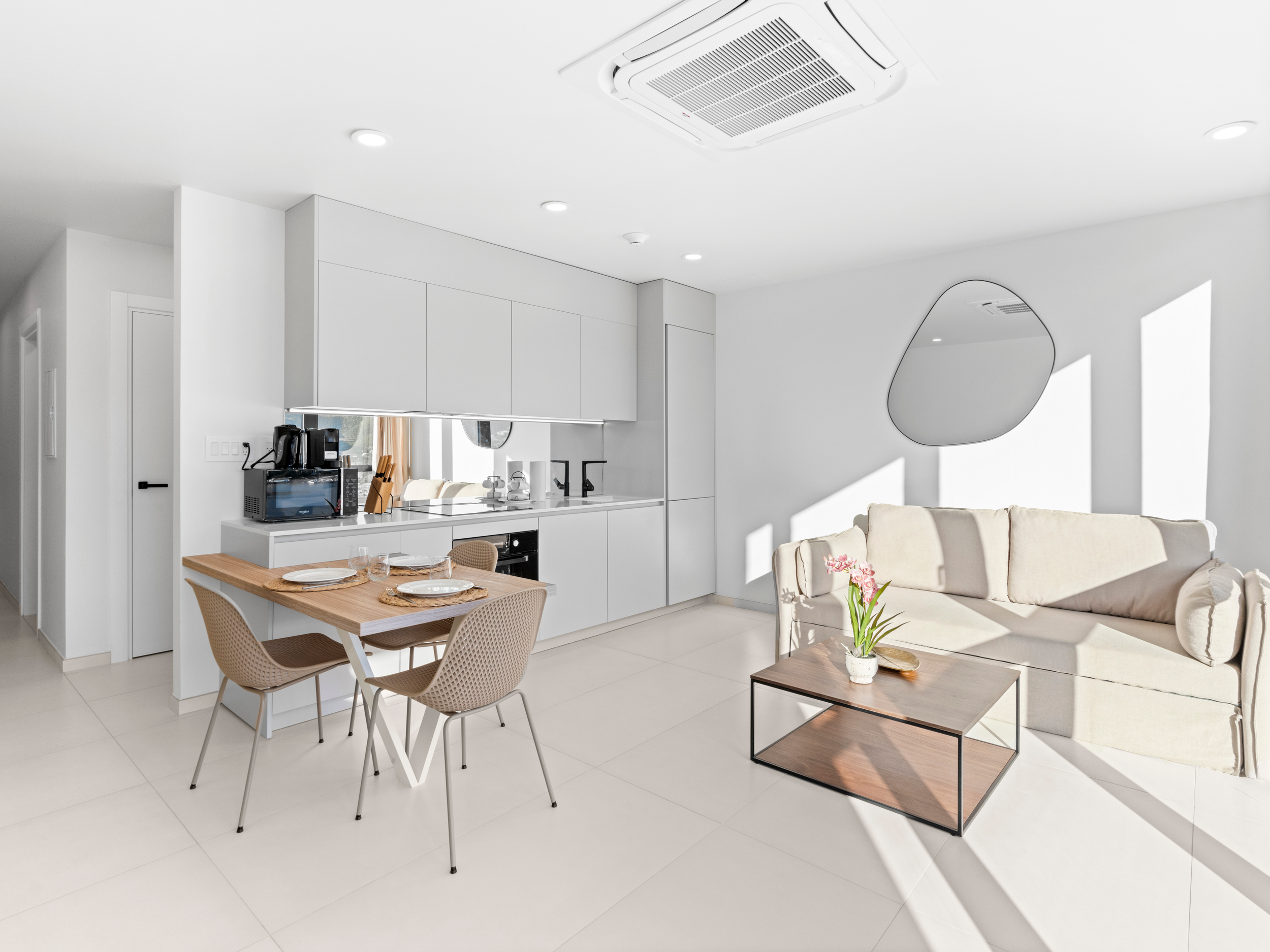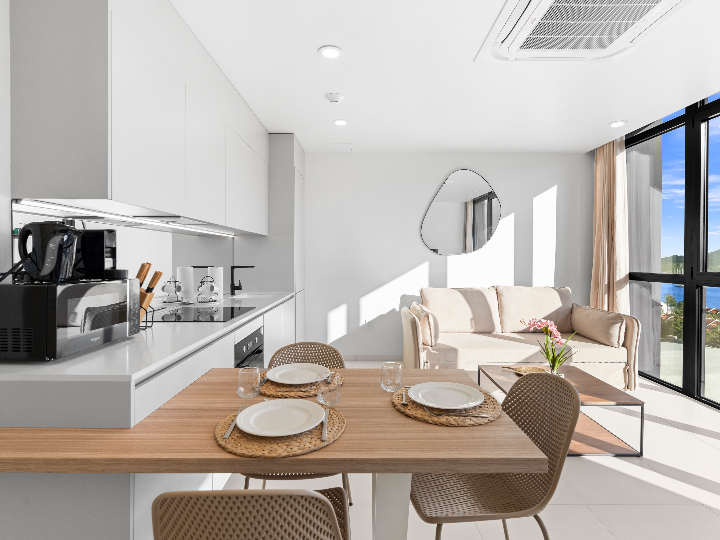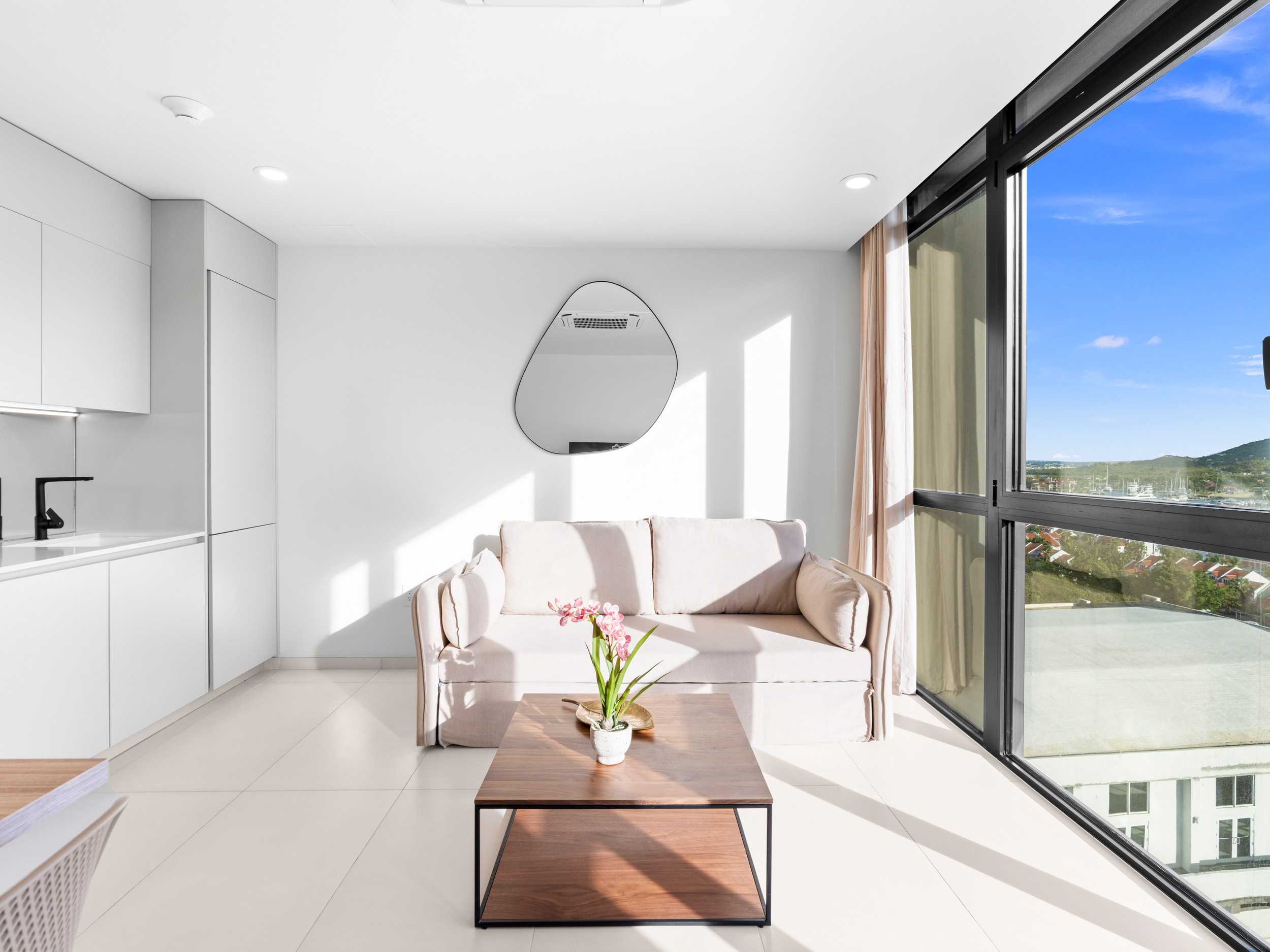 Le vaste séjour est idéal pour recevoir ou simplement se détendre. La baie vitrée panoramique offre une vue imprenable sur le lagon, créant une atmosphère sereine et magique. Imaginez-vous savourant votre café du matin en admirant le lever du soleil sur les eaux scintillantes du lagon.
