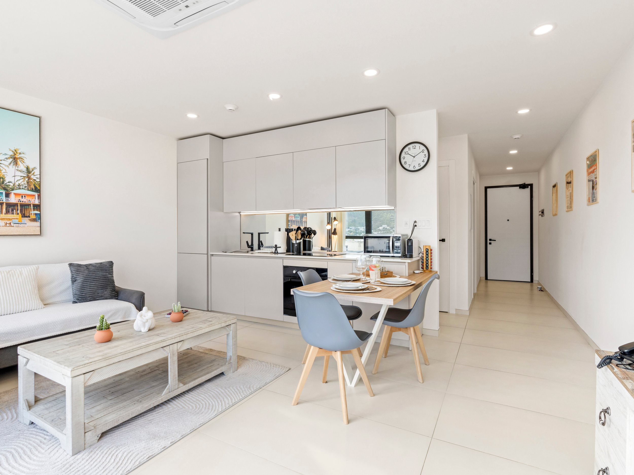 As you step into A123, you’re welcomed by a light-filled, contemporary space that feels both warm and elevated. The open-concept layout creates a seamless flow between the kitchen, dining, and living areas—perfect for cozy nights in or laid-back mornings with a view.