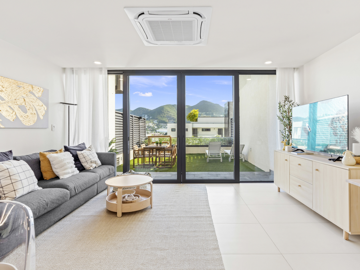 What truly sets B206 apart is its expansive outdoor terrace—the largest in Building Two. Picture yourself unwinding on plush loungers, sipping a cocktail at the high-top bar, or enjoying a meal al fresco, all while soaking in views of the serene lagoon and surrounding hills. It’s your private sanctuary for unforgettable sunsets and starlit evenings.