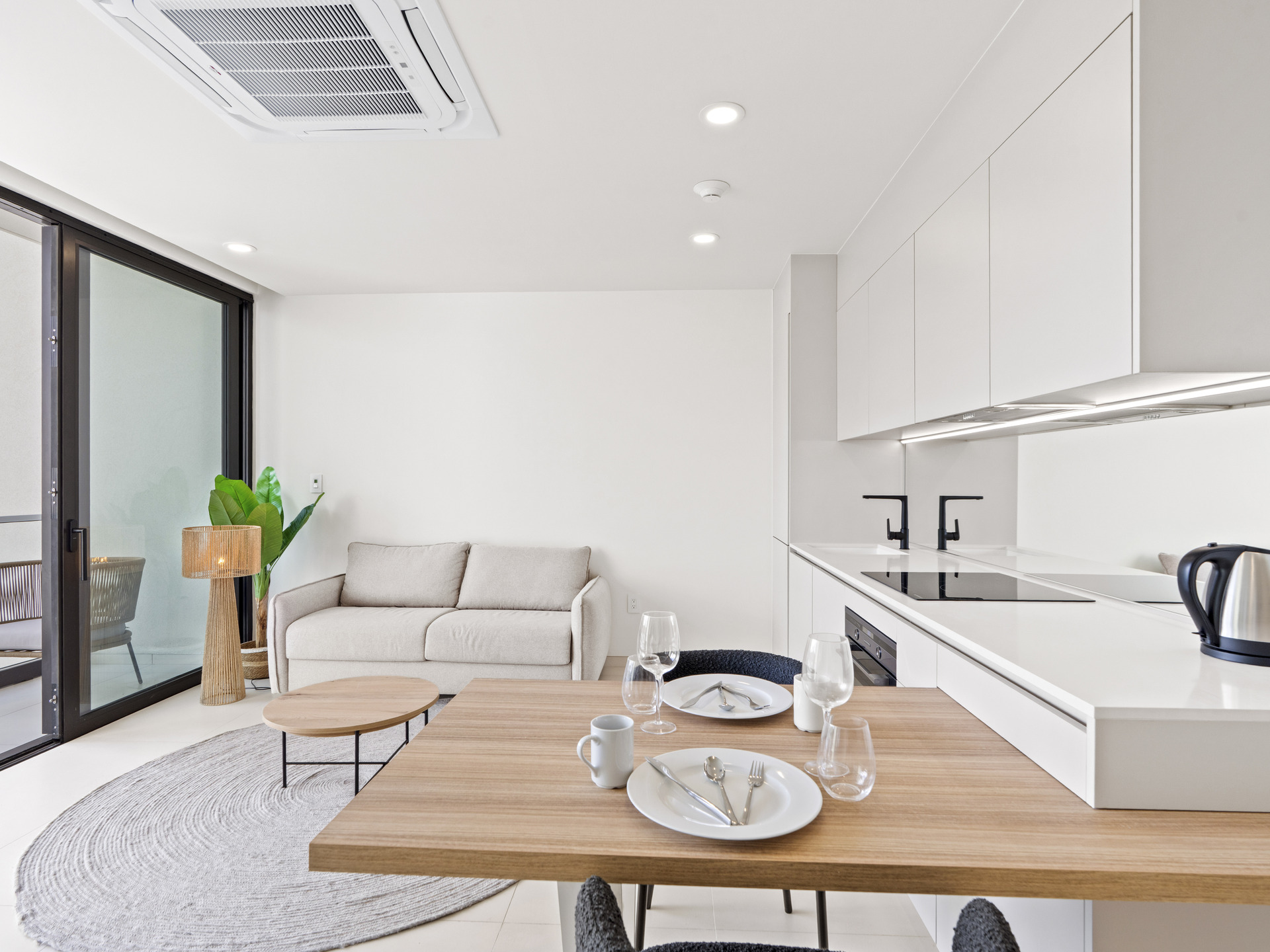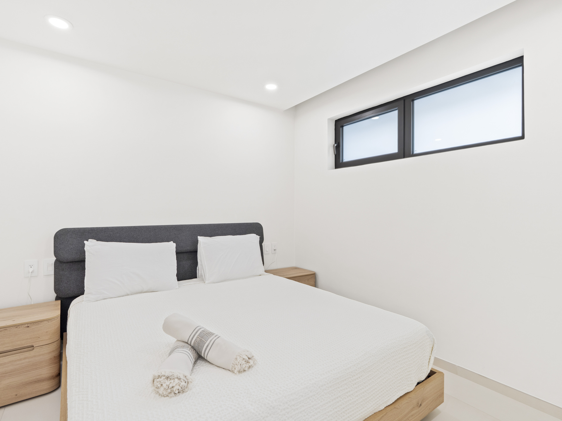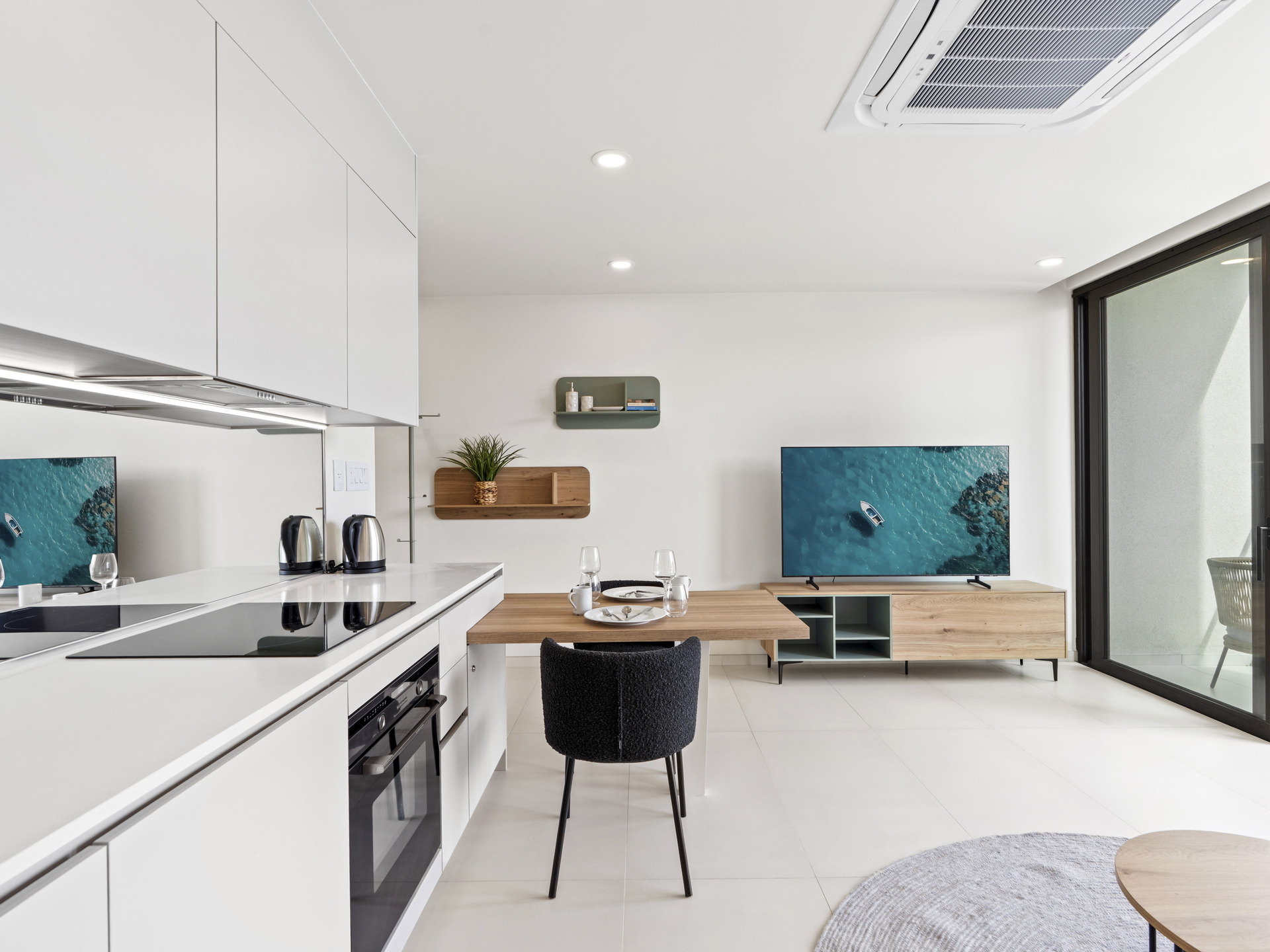 The apartment features a cozy bedroom, a stylish bathroom, and a bright living area where you can relax after a day of exploring the island. Large windows bring in natural light, creating a warm and inviting space.