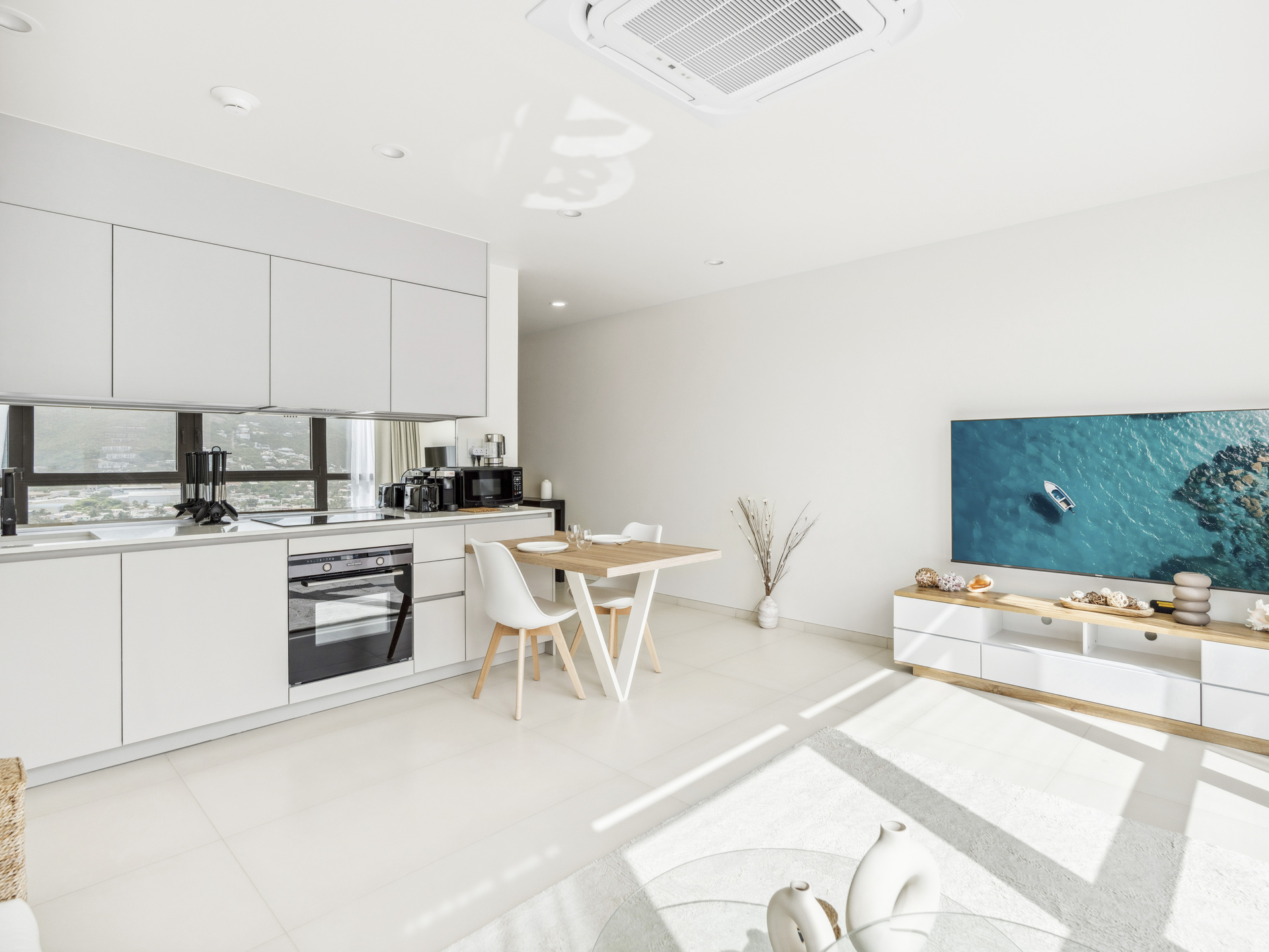 Fully equipped kitchen with a refrigerator, oven, dishwasher, toaster, and Nespresso coffee machine