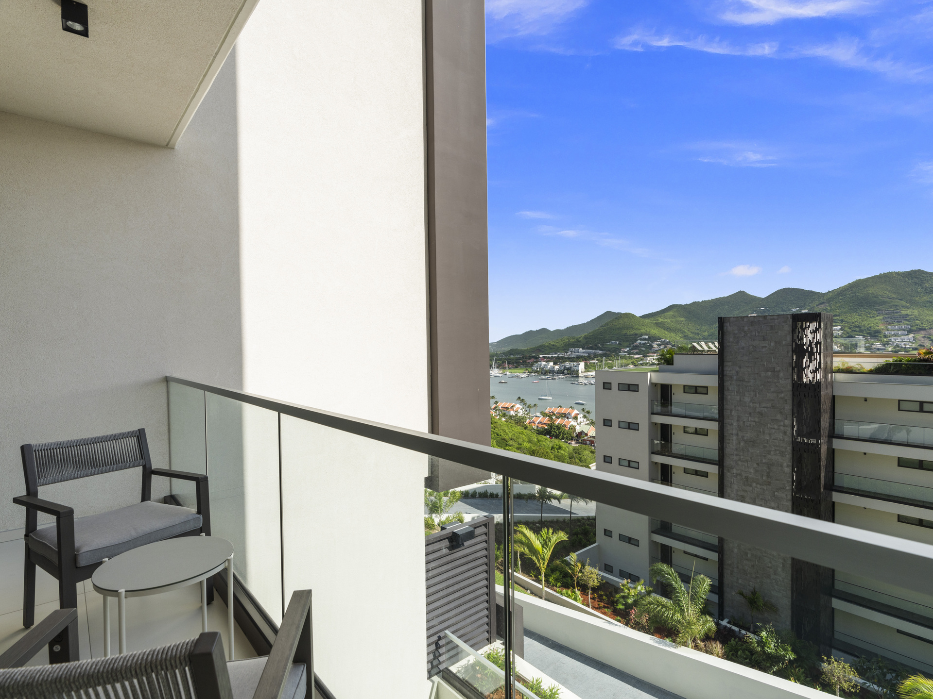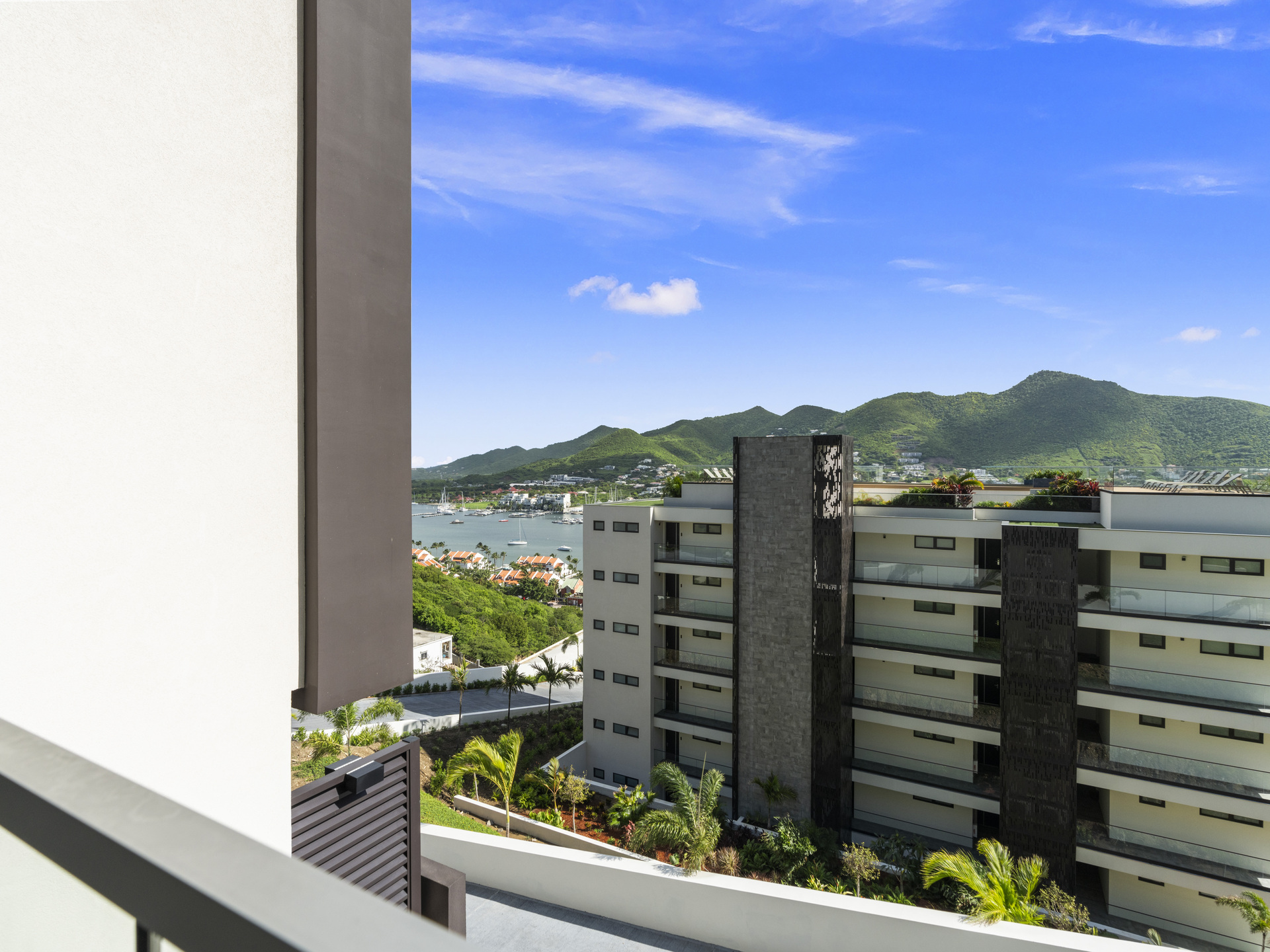 Residents and guests of The Hills Residence enjoy two levels of secure parking, 24/7 security, and access to the rooftop pool and jacuzzi on Level 5, where panoramic views of the lagoon and Simpson Bay create the perfect backdrop for relaxation.