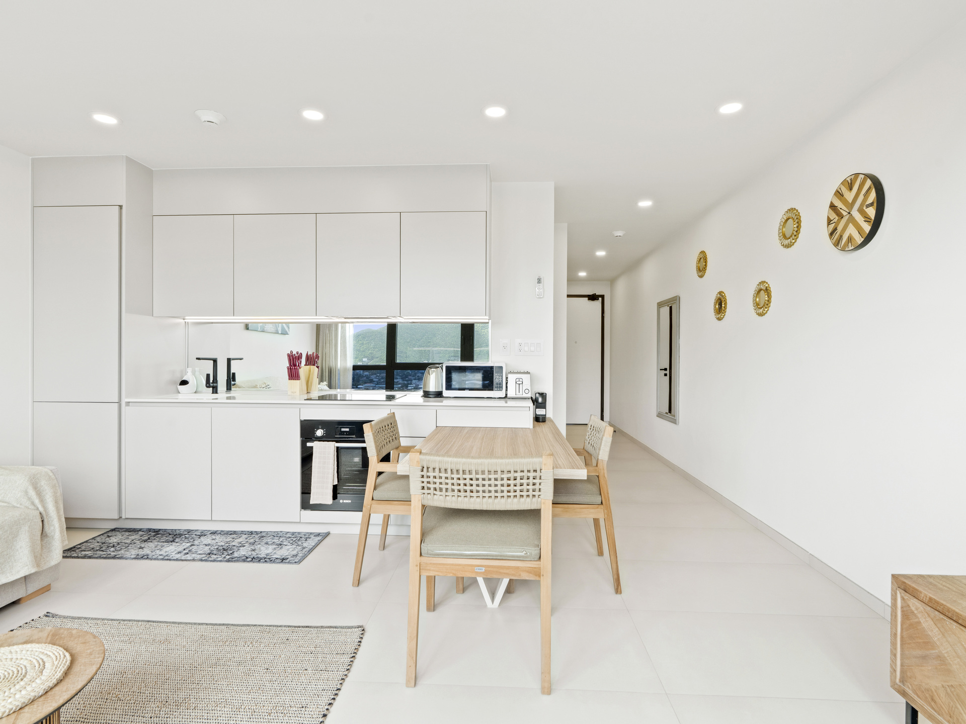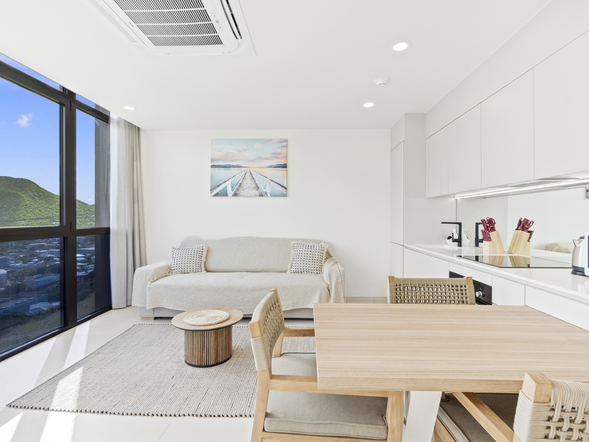 The showstopping feature of this residence is the floor-to-ceiling wall of glass, which floods the interior with natural light and provides uninterrupted panoramic views, bringing the beauty of the outdoors right into your living space. The open-concept living and dining area is thoughtfully designed with contemporary furnishings and a warm, inviting ambiance — ideal for both relaxing and entertaining.